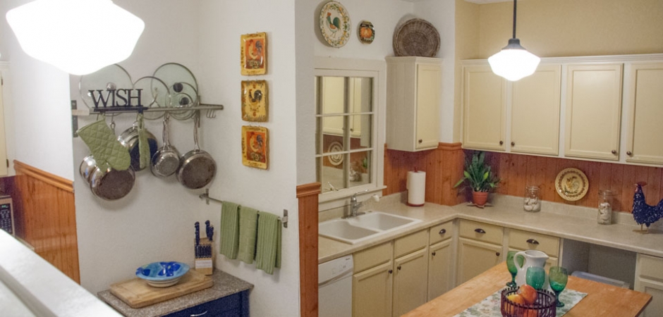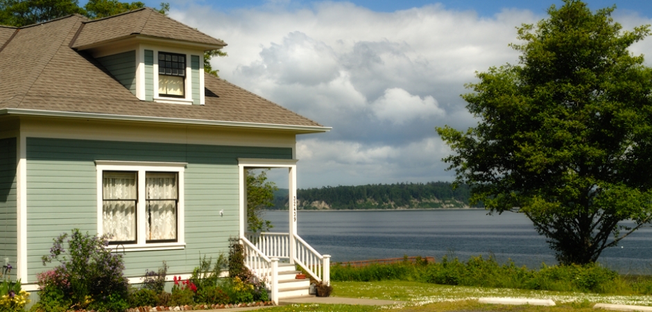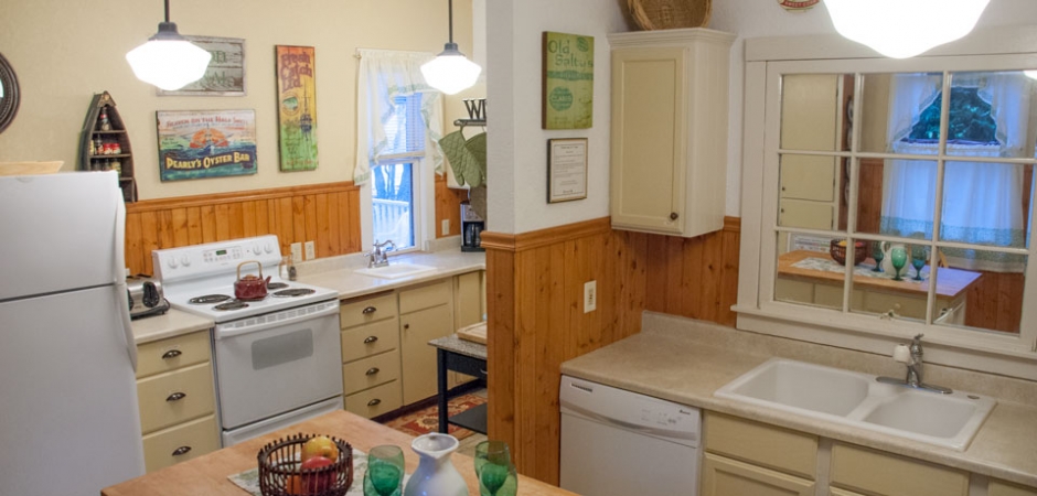 This distinguished, old home (the green house) has three comfortable bedrooms each with their own full bath, two sleeper sofas and  can sleep up to ten people.  It features a large, fully stocked kitchen, dining room and living room with a fireplace.  The living room can be closed off to create a private suite for guests who desire even more spacious surroundings.